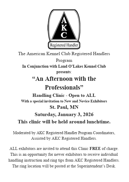 ALL exhibitors are invited to attend this Clinic FREE of charge. This is an opportunity for newer exhibitors to receive individual handling instruction and ring tips from AKC Registered Handlers.